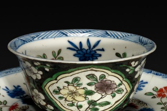 本品规格为直径12.2厘米,高度4.1厘米。以瓷为胎,胎质细腻。表面施五彩釉,色彩丰富,有红、蓝、绿、黄、紫等多种颜色,色彩搭配鲜艳且和谐,釉面光泽亮丽,尽显五彩瓷器的绚丽特色。由杯和碟组成,杯为敞口,深腹,造型规整;碟为浅盘状,与杯相配合,整体造型简洁实用,符合日常杯碟的使用需求,同时线条流畅,给人一种雅致的感觉。杯和碟上都绘有精美的花卉纹饰,花卉种类多样,形态各异,色彩丰富。杯身以深色为地,开窗绘制花卉,碟面也布满花卉图案,纹饰精细,构图巧妙,体现了清代五彩瓷器装饰工艺的精湛,将花卉的柔美与生机展现得淋漓尽致。