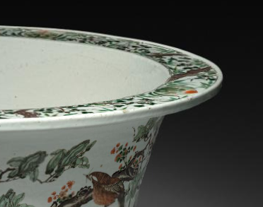主要用于栽种花卉或盆栽植物,是清代园林、庭院或室内用于美化环境、摆放花卉的器具。其精美的五彩花鸟纹饰,不仅具有实用价值,还兼具艺术观赏价值,体现了清代陶瓷工艺与园林装饰艺术的结合,彰显主人的审美情趣。